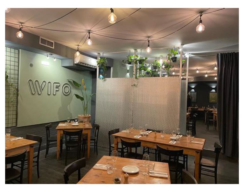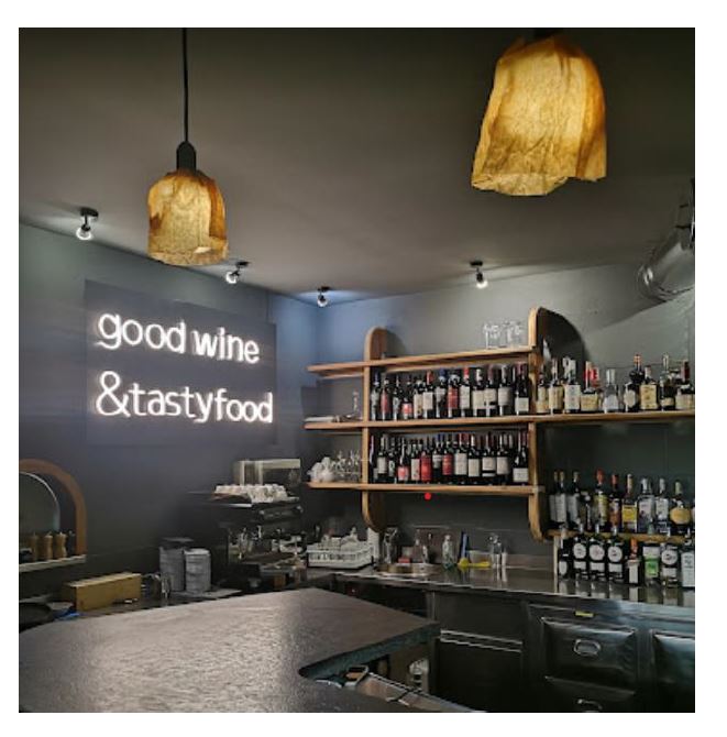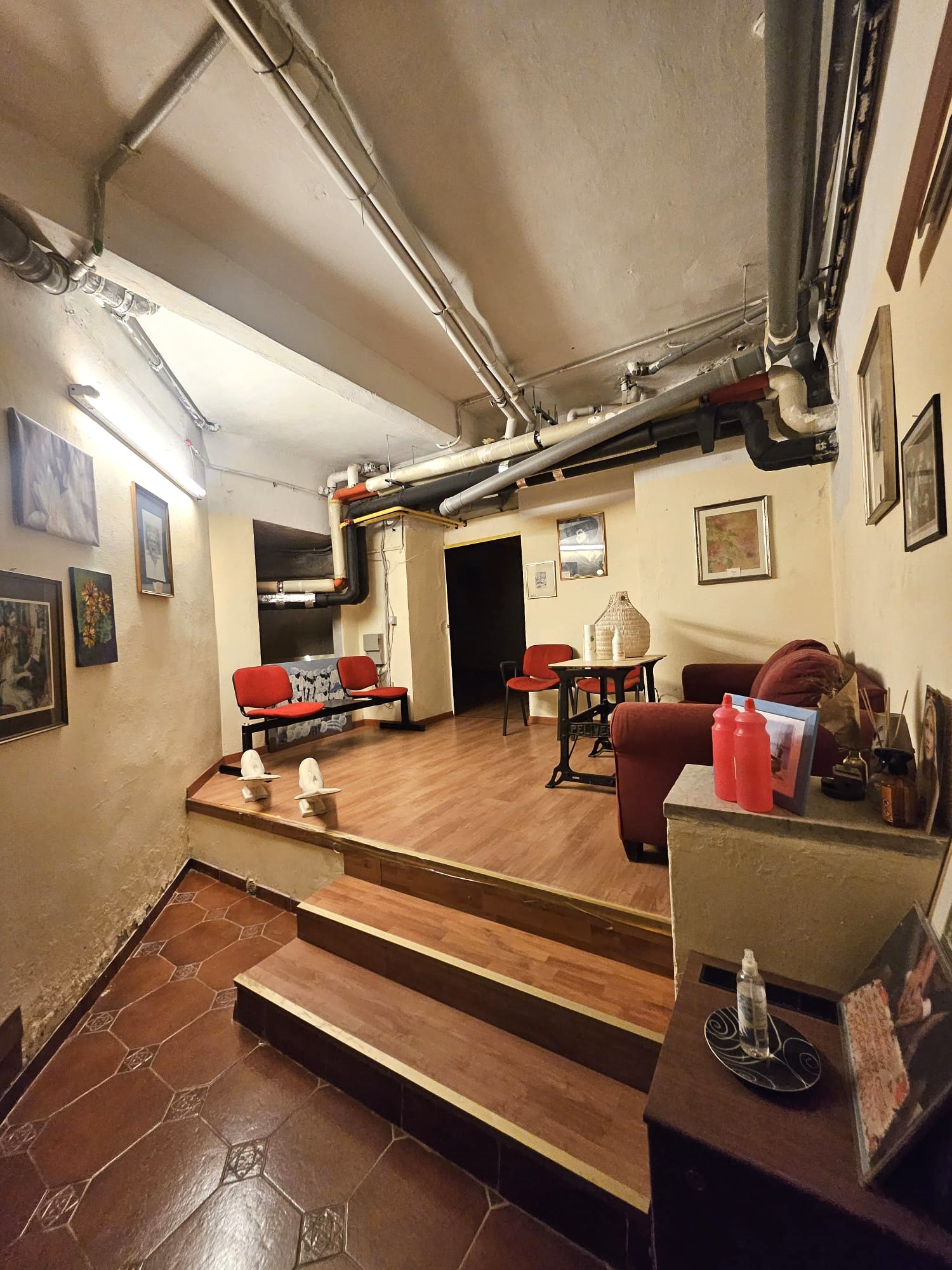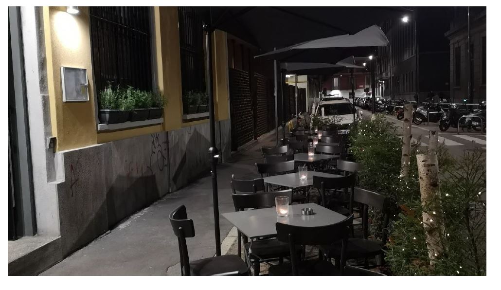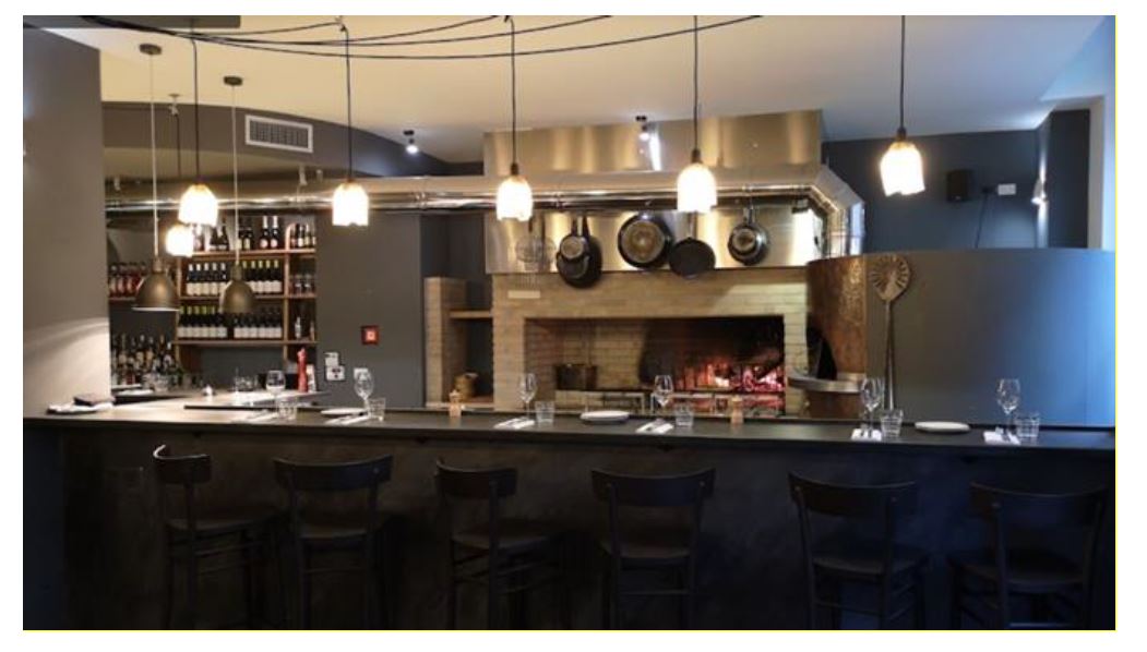 Descrizione: grande ambiente destinato alla somministrazione di bevande, con bancone sul lato destro che comprende il forno a legna, il barbecue per la preparazione a vista delle pietanze e l’area bar. Tale ambiente è dotato di due ampi serramenti vetrati prospicienti la via della Commenda.