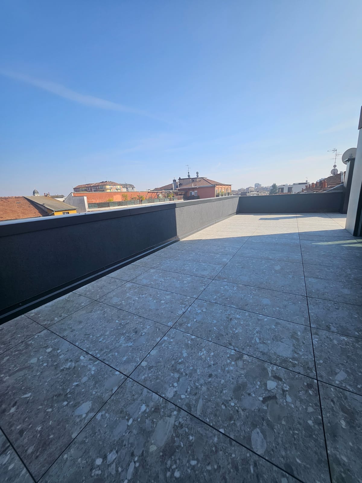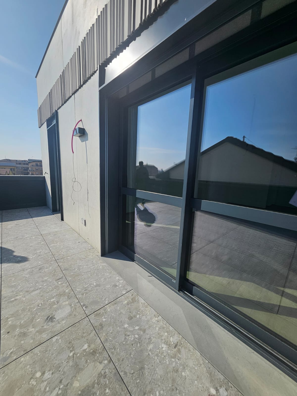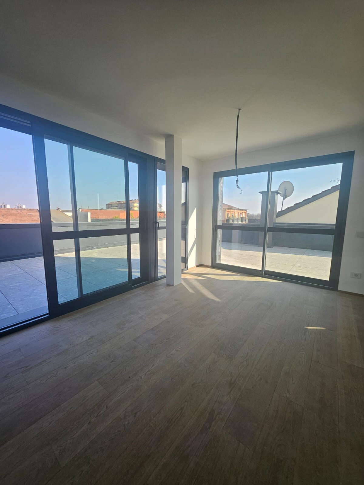 Descrizione: l’appartamento è composto da un soggiorno con ampie vetrate che si affacciano su un grande terrazzo angolare con vista panoramica, cucina a