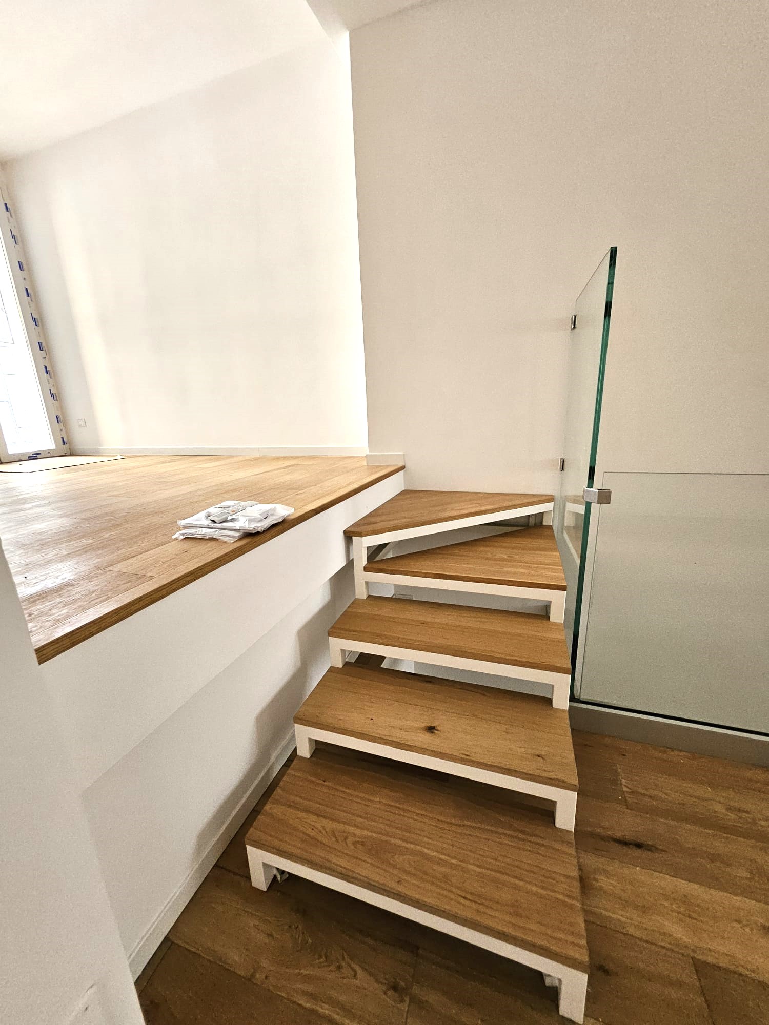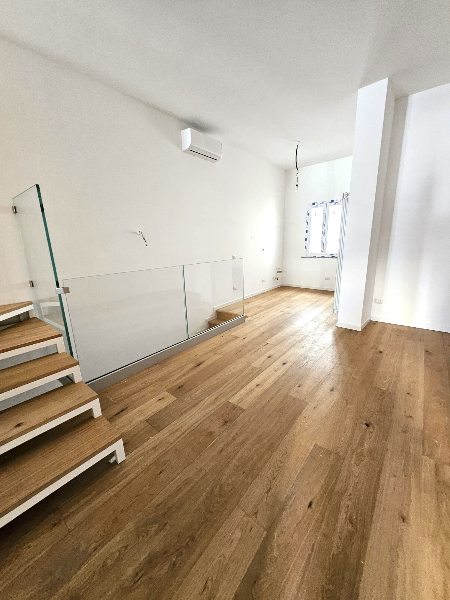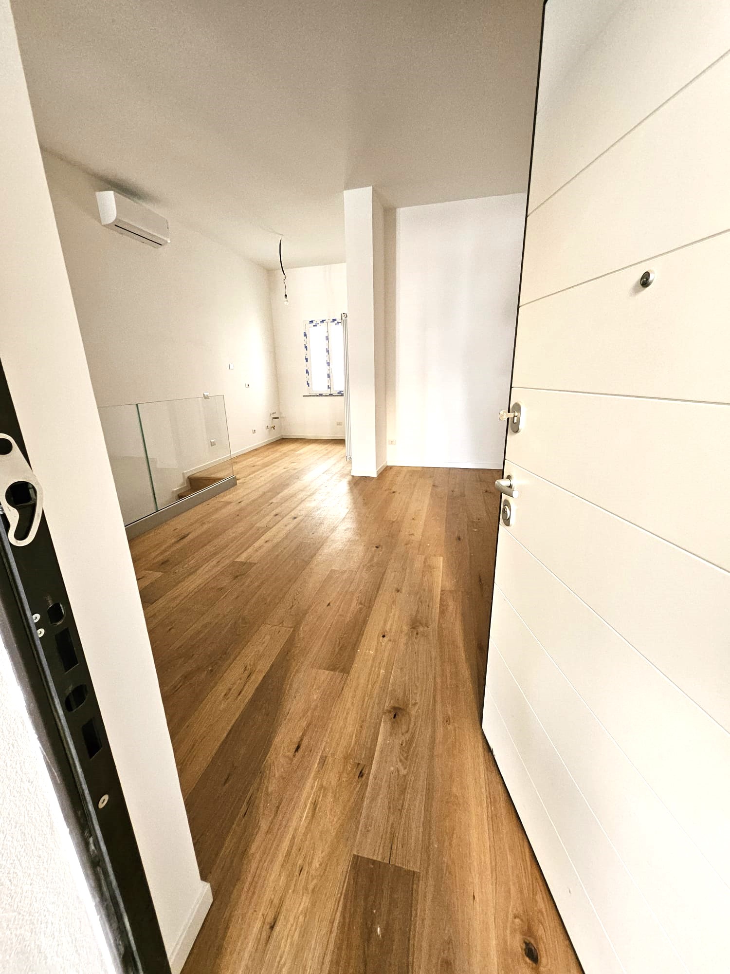 - Piano rialzato: ingresso e luminosa zona giorno open space. L’ambiente, ampio e accogliente, comprende una moderna area living con piacevole soppalco e un bagno.