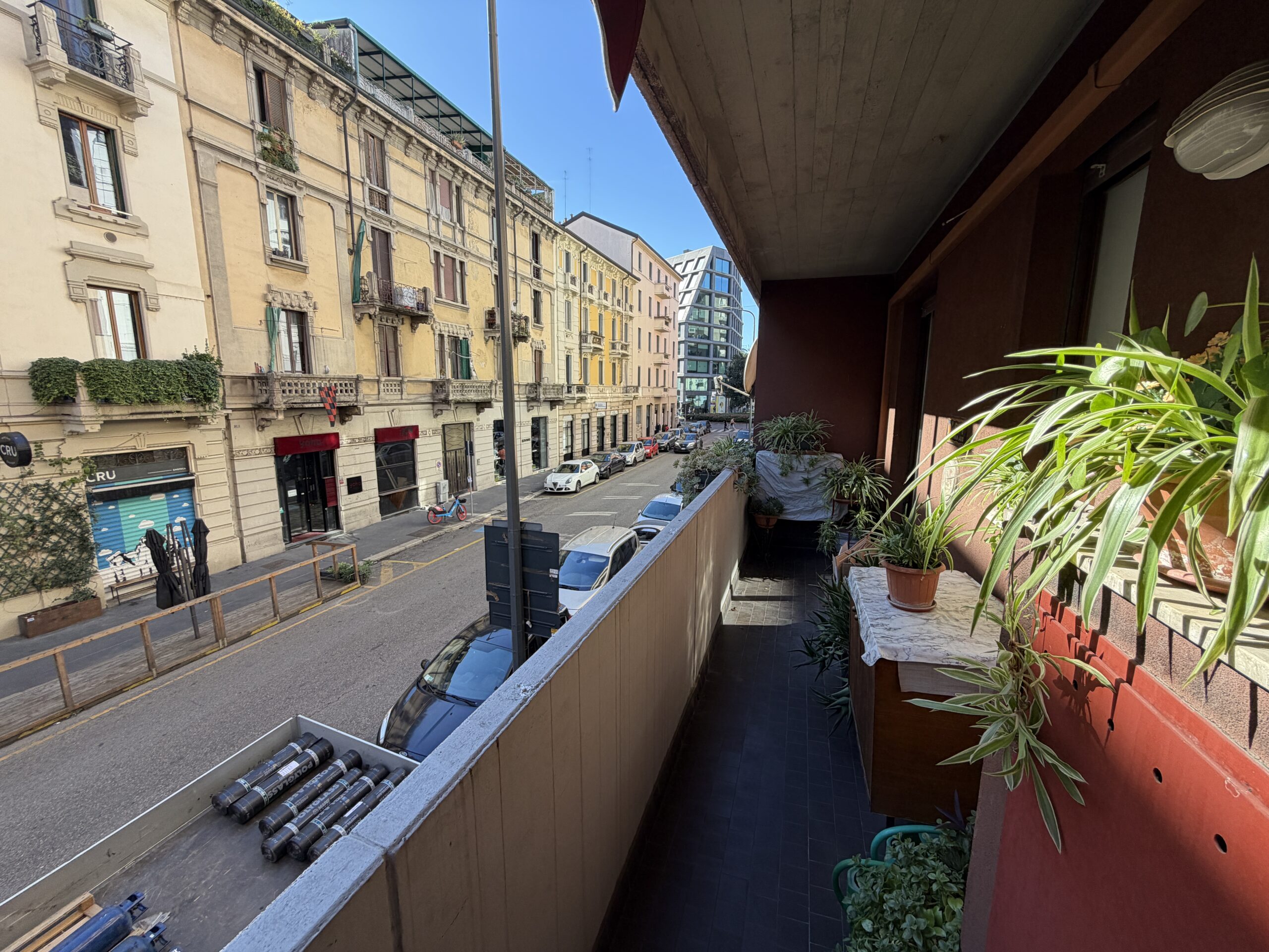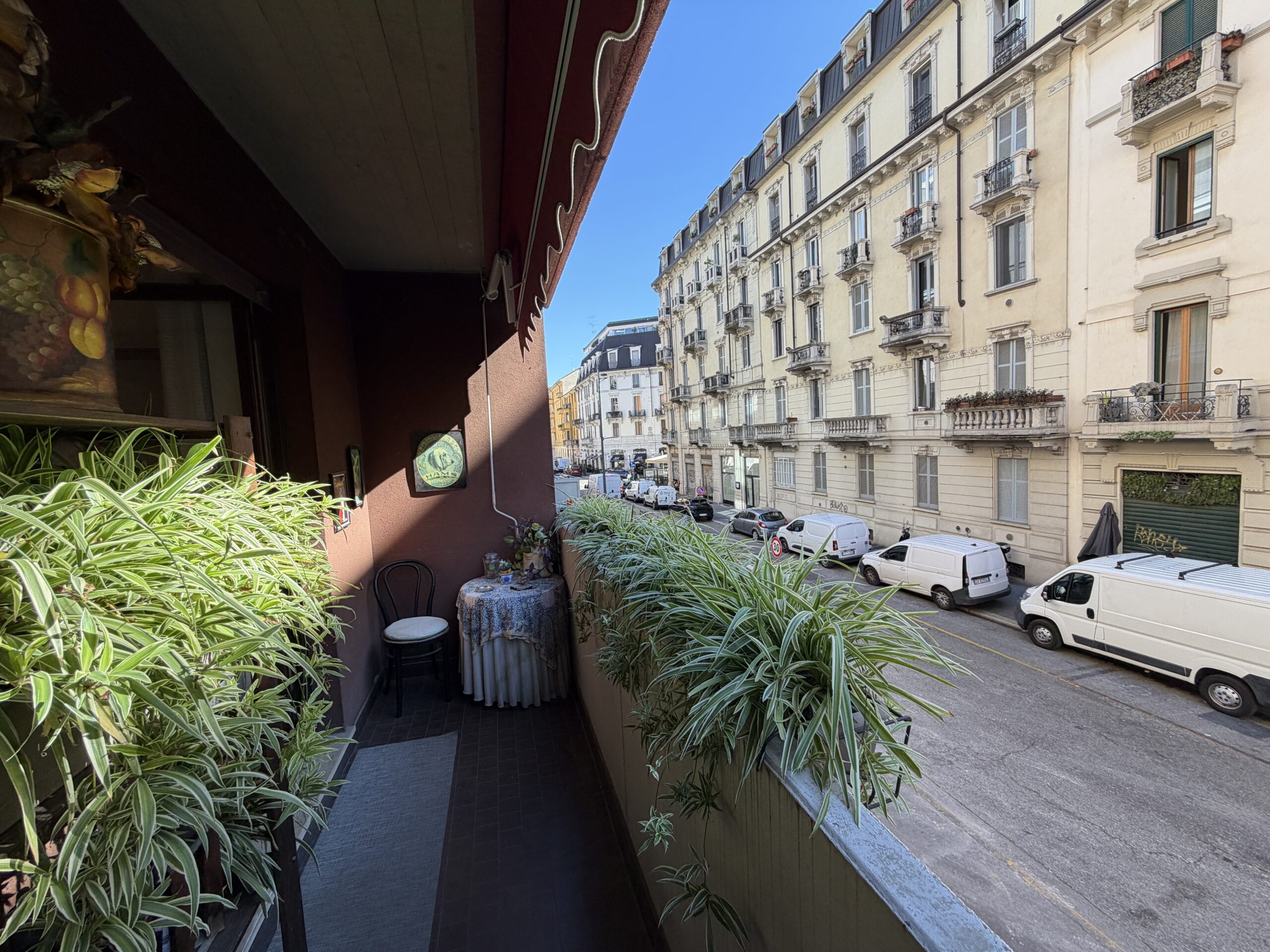 Sia il soggiorno che la camera sono affacciati su una lunga balconata vivibile con esposizione su Via Ugo Bassi, tramite porta finestra.